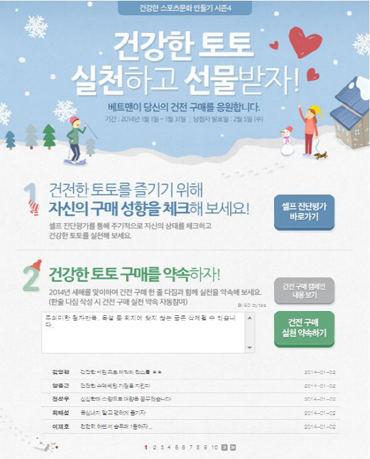 두 번째 이벤트인 '건강한 토토 구매를 약속하자!'의 경우 2014년 새해를 맞이하여 건전 구매를 위한 한 줄 다짐과 실천을 약속하는 방식으로 진행된다. 한 줄 다짐 작성 시 건전 구매 실천 약속은 자동으로 참여 처리되며, 이벤트 페이지 내에 위치한 빈칸에 한 줄로 건전한 참여를 위한 내용을 저장하면 된다. 이벤트에 참여한 사람들에게는 추첨을 통해 15명에게 벳머니 5만원권을 증정하며, 10명에게는 벳볼 3000개씩을 나눠준다.