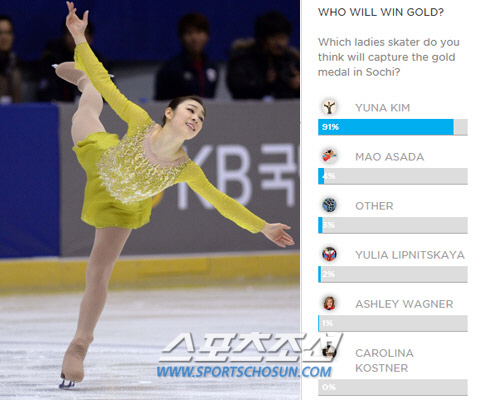 김연아는 90% 이상의 투표율을 혼자 독식하면서 4% 투표를 얻는데 불과한 2위 아사다 마오를 큰 차이로 따돌리고 있는 것. 김연아가 2010 밴쿠버올림픽에 이어 2014 소치올림픽에서도 또 한 번 금메달을 딸 것이라는 미국인과 세계인들의 확신이 담긴 결과라 더욱 관심을 모으고 있다.