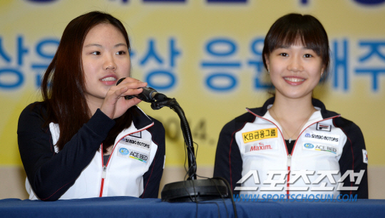 소치 동계올림픽 빙상 대표선수단의 미디어데이가 15일 태릉국제스케이트장에서 열렸다. 김연아와 함께 피겨스케이팅에 출전하는 김해진과 박소연이 질문에 답하고 있다. 태릉=허상욱 기자 wook@sportschosun.com