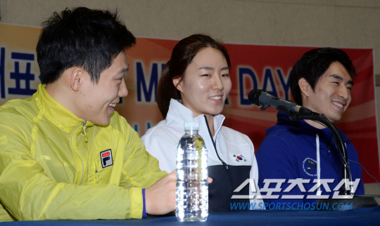 소치 동계올림픽 빙상 대표선수단의 미디어데이가 15일 태릉국제스케이트장에서 열렸다. 스피드스케이팅 모태범 이상화 이승훈이 질문에 답하고 있다. 태릉=허상욱 기자 wook@sportschosun.com