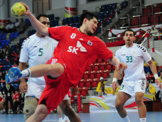 | ◇박중규가 2일 바레인 마나마의 칼리파 스포츠시티홀에서 열린 사우디와의 아시아선수권 조별리그 최종전에서 슛을 시도하고 있다. 사진캡처=아시아핸드볼선수권 홈페이지 |
