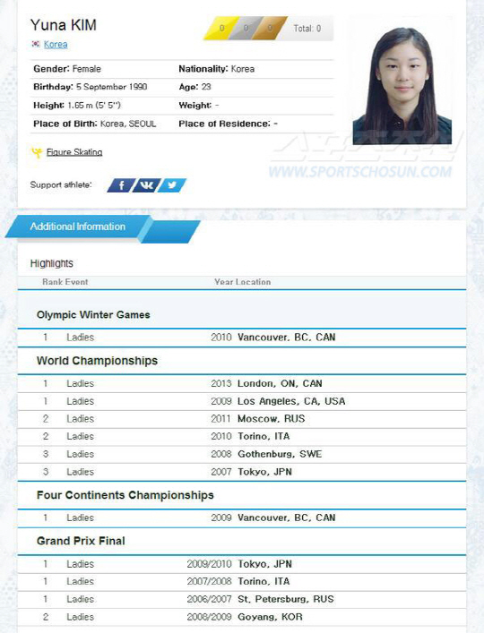 김연아 소치올림픽 공식프로필, 김연아 키-아기 얼굴-그랜드슬램 위엄 |