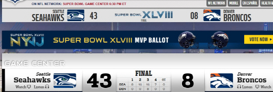일찌감치 희비가 엇갈렸다. 시애틀은 NFL 슈퍼볼 사상 최단 시간 득점에 성공했다. 상대의 실수로 얻은 행운의 점수였다. 시애클의 킥 오프로 경기가 시작했고, 덴버가 첫 번째 스냅을 얻었다. 덴버 센터백 매니 라미레스가 쿼터백 페이튼 매닝에게 패스한 공이 매닝의 얼굴과 어깨를 스친 후 덴버 진영 엔드존으로 날아갔다. 덴버 러닝백 노손 모레노가 전력질주해 공을 품에 안았지만 이미 공은 엔드존을 넘어선 후였다. 시애틀은 기대하지 않았던 세이프티로 2점을 얻었다. 2007년 2월 시카고 베어스의 데븐 헤스터가 인디애나폴리스 콜츠와의 슈퍼볼에서 14초 만에 득점한 기록을 넘어서는 최단 시간 득점이었다.
