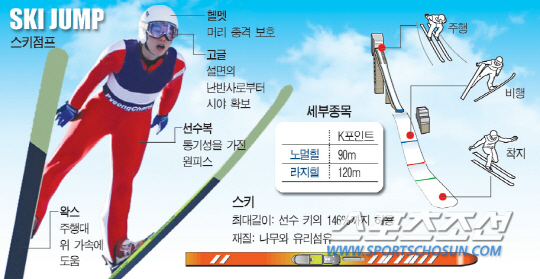 북유럽 지방의 놀이에서 유래한 스키점프는 '인간 새'들이 창공으로 날아오르는 모습을 보면서 짜릿함을 느끼는 경기다. 스포츠로 자리 잡은 건 19세기 후반부터다. 1862년 노르웨이에서 첫 대회가 열린 것으로 알려졌다. 동계올림픽에서는 1924년 샤모니 대회부터 정식 종목으로 선보였고, 이후 1964년 인스브루크 대회 때는 라지힐(Large Hill) 종목이 추가되는 등 발전해왔다. 2011년 4월 국제올림픽위원회(IOC)가 여자 스키점프를 올림픽 정식종목으로 추가하면서 2014 소치 올림픽에서는 여자 개인 경기가 처음으로 열린다. 세부종목은 도약대의 길이에 따라 노멀힐(Normal Hill)과 라지힐로 나뉜다. 점프대의 규격을 분류할 때는 'K'라는 약자가 쓰이는데 K-95는 비행 기준 거리가 95m라는 의미다. 소치 올림픽에는 남자 개인 노멀힐(K-90), 남자 개인 라지힐(K-120), 남자 단체(K-120), 여자 개인 노멀힐(K-90)에 4개의 금메달이 걸려 있다. 도약대에서 점프하고 나서 최대한 멀리 날아가 착지해야 하기 때문에 사용되는 스키도 다른 종목과는 다르다. 재질은 나무와 유리섬유고, 길이는 활강 스키보다는 길지만 선수 키의 146%를 넘어서는 안 된다. 스키 길이에 대해서는 처음에는 규정이 별도로 없었지만 1998년 나가노 동계올림픽에서 일본이 금메달 두 개를 휩쓸자 유럽 쪽에서 반발, 길이를 제한하게 됐다.