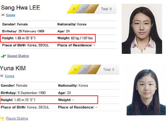 이와 반대로 김연아는 키 165cm로 공개했지만, 체중을 밝히지 않아 궁금증을 자아내고 있다.