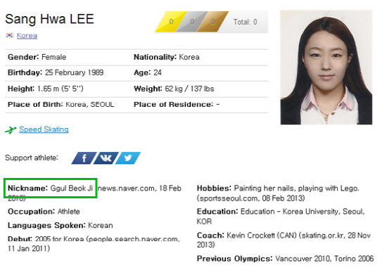 이 중에서도 특히 스피드스케이팅 선수 이상화의 공식 프로필에 관심이 쏠리고 있다. 키165cm에 체중 62kg으로 소개된 이상화는 자신의 별명을 '꿀벅지'(Ggul Beok Ji)로 소개하는 센스를 발휘, 보는 이들의 웃음을 자아낸다.