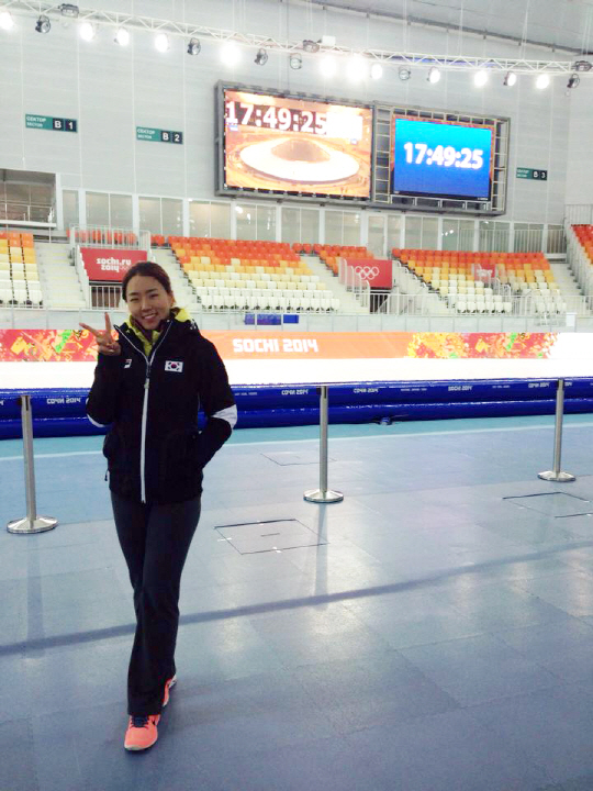 사진 속 이상화는 결전지인 러시아 소치의 아들레르 아레나 스피드스케이팅 센터에서 태극마크가 새겨진 대표팀 트레이닝복을 입고 환한 미소와 함께 승리의 브이(V)를 그리며 포즈를 취하고 있다.