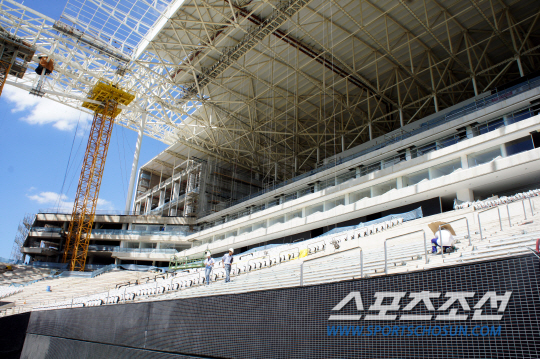 한편, 현재 완공률이 97%인 아레나 데 상파울루 경기장 건설에 악재가 끊이지 않고 있다. 국제축구연맹(FIFA)가 정한 완공시기(지난해 12월)를 건너 뛴데 이어 한 번 연장한 완공일자(2월 18일)를 또 다시 지키지 못하게 됐다. FIFA의 경고에 마무리 공사를 무리하게 진행하다 크레인이 전복돼 인부가 사망하는 사건까지 발생했다. 아레나 데 상파울루는 FIFA에 완공시기를 4월 15일로 못박았다. 2만석에 해당하는 가변좌석 설치 공사와 내부 인테리어 작업만을 남겨뒀다. 그러나 경기장 측은 대수롭지 않다는 반응이다. 알베르토 부소장은 "대부분의 경기장이 리모델링을 하는데 여기는 아예 경기장을 처음부터 만들고 있다. 2011년 5월 31일 착공에 들어가 약 3년만에 완공하게 되면 준수한 편이다. 예정대로 진행되고 있다. 인부 사망 사고 때문에 3일간 묵념 기간을 갖느라 공사가 지연된 것 밖에 없다"고 말했다. 상파울루(브라질)=하성룡 기자 jackiechan@sportschosun.com