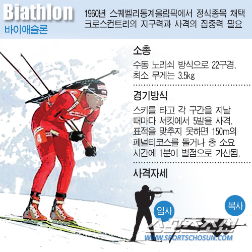 바이애슬론은 두가지 경기가 하나로 뭉쳐진 종목이다. 크로스컨트리와 사격이다. 크로스컨트리의 지구력과 사격의 집중력이 필요하다.