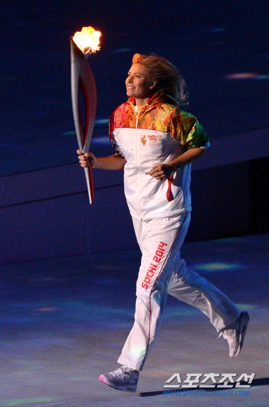 8일 오전(현지시간) 러시아 소치의 피시트 올림픽 스타디움에서 제22회 소치 동계올림픽의 화려한 막이 올랐다. 샤라포바가 성화를 봉송하고 있다. 한국은 이번 소치 올림픽에 아이스하키를 제외한 6개 종목에 동계 올림픽 사상 최대 규모인 선수 71명을 파견했다. 임원 49명을 포함한 선수단 규모도 120명으로 역대 최대. 역대 최대 규모의 선수단을 파견하는 한국은 메달 12개(금 4개·은 5개·동 3개)를 수확, 2006년 토리노·2010년 밴쿠버 대회에 이어 3회 연속 종합 10위권 내에 이름을 올리겠다는 목표를 세웠다. 입장하는 대한민국 선수단의 모습. 소치(러시아)= 사진공동취재단/ 2014.02.08.