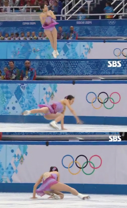 9일(한국시각) 러시아 소치 아이스버그 스케이팅 팰리스에서 벌어진 피겨 단체전 여자 싱글 쇼트프로그램에서 트리플악셀(공중 3회전 반) 중 실수를 범하고 있는 아사다 마오.