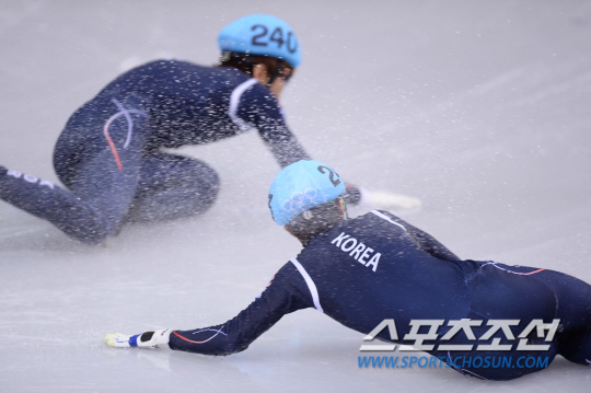 10일 오후(한국시간) 2014 소치 동계올림픽 아이스버그 스케이팅 팰리스에서 남자 쇼트트랙 1500m 경기가 열렸다. 준결승에서 한국 이한빈(왼쪽)과 신다운이 충돌하며 넘어지고 있다. 한국은 이번 소치 올림픽에 아이스하키를 제외한 6개 종목에 동계 올림픽 사상 최대 규모인 선수 71명을 파견했다. 임원 49명을 포함한 선수단 규모도 120명으로 역대 최대. 역대 최대 규모의 선수단을 파견하는 한국은 메달 12개(금 4개·은 5개·동 3개)를 수확, 2006년 토리노·2010년 밴쿠버 대회에 이어 3회 연속 종합 10위권 내에 이름을 올리겠다는 목표를 세웠다. 소치(러시아)= 김경민 기자 kyungmin@sportschosun.com