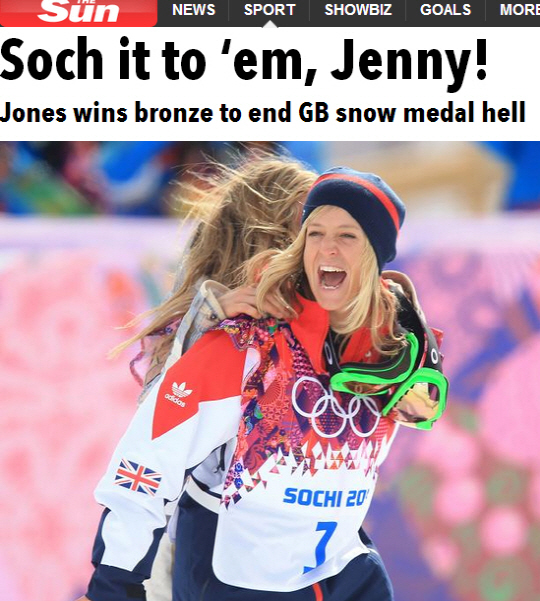 2014년 소치 동계올림픽에서 첫 메달이 나왔다. 제니 존스(25)는 9일(한국시각) 러시아 소치의 로사 쿠토르 익스트림 파크에서 열린 소치 동계올림픽 여자 스노보드 슬로프스타일 결승에서 1, 2차 합계 87.25점으로 동메달을 목에 걸었다. 4위 사이나 캔드리안(스위스)와는 불과 0.25점 차이 밖에 나지 않는 짜릿한 성과다.