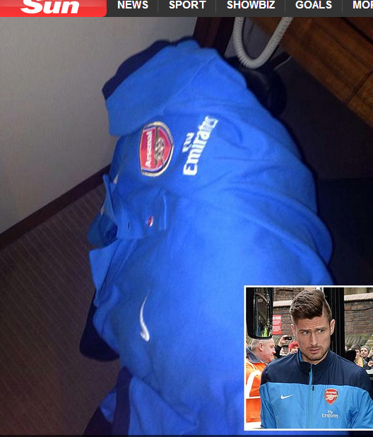 ◇셀리아 카이가 지루의 방에서 찍었다고 주장하는 아스널의 팀 트레이닝복 사진. 사진캡처=더선 홈페이지