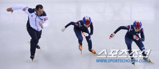 9일 오후(한국시간) 2014 소치 동계올림픽 스케이팅 훈련장에서 한국 쇼트트랙 선수들의 훈련이 열렸다. 최광복 코치(왼쪽부터)가 김아랑, 김윤재와 스타트 경쟁을 벌이고 있다. 소치(러시아)= 김경민 기자 kyungmin@sportschosun.com / 2014.02.09.