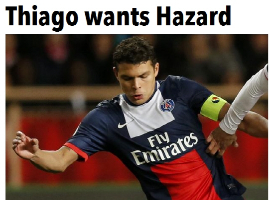 PSG의 핵심 수비수 치아구 시우바가 요즘 가장 핫한 사나이 에당 아자르(첼시)를 원하고 있다. 아자르는 지난 뉴캐슬과의 경기에서 해트트릭을 기록했다. 조제 무리뉴 감독은 아자르가 젊은 선수들 중 세계 최고라고 칭찬을 아끼지 않았다. 뜨거운 아자르를 향해 돈이라면 둘째가라면 서러운 PSG가 관심을 보이고 있다. 아자르는 2012년 여름에도 PSG의 러브콜을 받았지만, 첼시를 택했다.