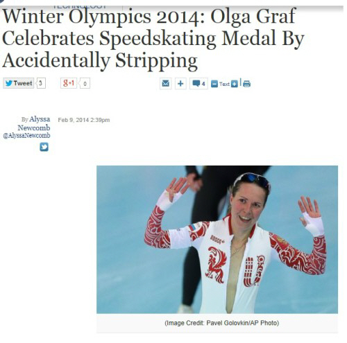 '너무 기쁜 나머지 가슴 노출?' 무명의 러시아 대표 올가 그라프(31)가 '대형사고'를 쳤다. 10일(한국시각) 스피드스케이팅 여자 3000m에서 4분03초47의 기록으로 '깜짝 동메달'을 목에 걸었다. 시즌 최고기록을 0.82초 앞당기며 개최국 러시아에 첫 메달을 안겼다. 몸에 딱 붙는 첨단 소재 경기복 안에 아무것도 입지 않았다. 첫 메달의 기쁨에 도취된 그라프는 이 사실을 망각했다. 상반신 지퍼를 배꼽 부위까지 시원하게 내린 채 신나게 트랙을 질주했다. 아찔한 세리머니였다. 뒤늦게 '사고'를 인지하고 지퍼를 올렸지만 이미 한바퀴를 돈 이후였다. 그라프는 "깜빡 했다. 좋은 선수복인데 몸에 꽉 낀다. 숨을 쉬고 싶어 벗어버리고 싶었나보다"라며 웃었다. "영상이 유튜브에 게재될지도 모르겠다. 그러나 그것도 별로 나쁘지 않은 일 아닌가"라며 '쿨'한 반응을 보였다.