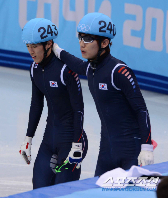 10일 오후(한국시간) 2014 소치 동계올림픽 아이스버그 스케이팅 팰리스에서 남자 쇼트트랙 1500m 경기가 열렸다. 준결승에서 충돌하며 결승행이 좌절된 한국 이한빈(오른쪽)이 신다운을 위로하고 있다. 한국은 이번 소치 올림픽에 아이스하키를 제외한 6개 종목에 동계 올림픽 사상 최대 규모인 선수 71명을 파견했다. 임원 49명을 포함한 선수단 규모도 120명으로 역대 최대. 역대 최대 규모의 선수단을 파견하는 한국은 메달 12개(금 4개·은 5개·동 3개)를 수확, 2006년 토리노·2010년 밴쿠버 대회에 이어 3회 연속 종합 10위권 내에 이름을 올리겠다는 목표를 세웠다. 소치(러시아)= 김경민 기자 kyungmin@sportschosun.com / 2014.02.10.