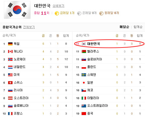 이는 금메달 없이 은, 동메달을 다수 갖고 있는 일본, 체코, 이탈리아 등을 앞선 순위여서 네티즌들은 "이상화의 위엄"이라며 소치 올림픽 순위를 보고 있다.