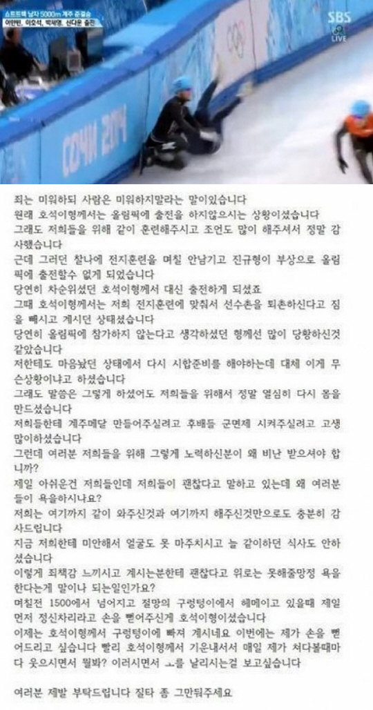 14일 대한체육회 SNS에 신다운 선수가 글을 게재했다. 이는 앞서 13일 오후(한국시각) 소치 아이스버그 스케이팅 팰리스에서 쇼트트랙 남자 5000m 계주 준결승 경기에서 이호석 선수가 코너를 돌면서 미국 선수와 충돌해 3위로 들어왔고, 이에 대해 이호석을 향한 질타가 이어진 것에 대해 신다운 선수가 한마디 글을 남겼다.