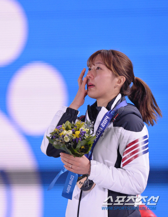 그는 14일(이하 한국시각) 러시아 소치 올림픽 파크 메달 플라자에서 열린 쇼트트랙 여자 500m 메달 수여식에서 동메달을 목에 걸렸다. 그녀의 뺨은 눈물이 훔쳤다. "동메달을 따서 그런 것이 아니에요. 가족 얘기가 나와서…. 진짜 울지 않으려고 했는데." 눈은 빨갛게 물들었지만 입가에는 애써 미소를 띄우려 했다. 경기 직후 상황이다.