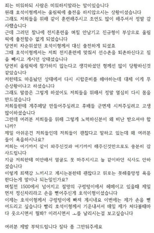 신다운은 "전지훈련을 며칠 남기고 (노)진규 형이 부상으로 올림픽에 출전할 수 없게 되었다. 선수촌에서 짐을 빼고 있던 호석이 형은 많이 당황하셨다"며 "저희에게 메달을 만들어 주시려고, 군면제 시켜 주시려고 정말 고생을 많이 하셨다. 그런데 저희를 위해 노력하신 분이 왜 비난 받아야 합니까. 제일 아쉬운 것은 저희들인데, 저희들이 괜찮다고 하는데 왜 여러분들이 욕을 합니까?"라고 호소했다.