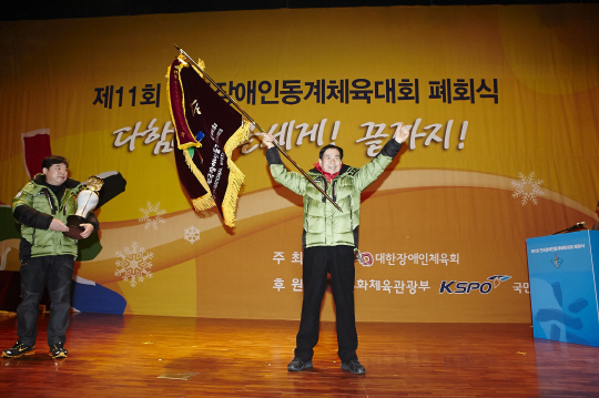 | 14일 폐막한 제11회 장애인동계체육대회에서 종합우승을 차지한 경기도 한성섭 총감독이 우승기를 들어올리며 환호하고 있다. |