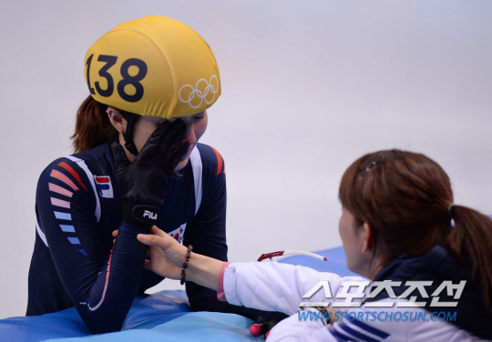 13일 오후(한국시간) 2014 소치 동계올림픽 아이스버그 스케이팅 팰리스에서 여자 쇼트트랙 500m 결승전이 열렸다. 경기에서 넘어져 3위에 그친 박승희가 눈물을 흘리자, 맏언니 조해리가 손을 잡으며 다독이고 있다. 소치(러시아)= 김경민 기자 kyungmin@sportschosun.com / 2014.02.13.