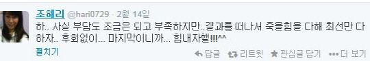 대한민국 여자쇼트트랙의 대표 에이스인 조해리는 유독 올림픽과는 인연이 없었다. 2002년 솔트레이크올림픽 당시 16세의 나이였지만 단 28일이 모자라 출전이 불발됐다. 2006년 토리노올림픽 직전엔 큰 부상을 당했다. 4년전 박승희와 함께 나선 첫 올림픽인 밴쿠버올림픽에선 노메달의 아픔을 맛봤다. 조해리는 밴쿠버올림픽 이듬해인 2011년 최고의 전성기를 맞았다. 2011년 2월 아스타나-알마티 동계아시안게임에서 여자 1500m 금메달, 1000m 은메달을 따낸 데 이어 3월 세계선수권 1000m 금메달, 1500m 동메달, 개인종합 우승을 이뤘다. 3000m 계주 멤버로 출전한 소치올림픽에서 아끼는 후배 박승희의 무릎 부상으로 1500m 출전 기회를 얻었다. '부담도 되고 부족하지만 결과를 떠나서 죽을 힘을 다해 최선만 다하자, 후회없이, 마지막이니까...힘내자 핼!!!'이라고 썼다. 마지막 올림픽, 마지막 개인전, '실격'은 아쉬웠다. 그러나 팀플레이어, 맏언니로서 최선을 다한 레이스였다. 전영지 기자 sky4us@sportschosun.com