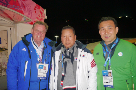 김정행 대한체육회장이 14일(한국시각) 2014년 소치동계올림픽 루지 경기가 열리고 있는 산악클러스터의 사키 슬라이딩 센터를 방문, 선수단을 격려하고 선전을 당부했다.
