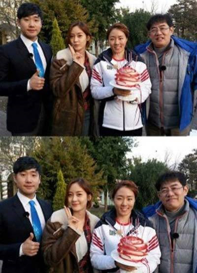 사진 속 이상화는 케이크를 들고 SBS 아나운서 배성재, '힐링캠프' MC 이경규, 성유리와 나란히 카메라를 응시하고 있다.