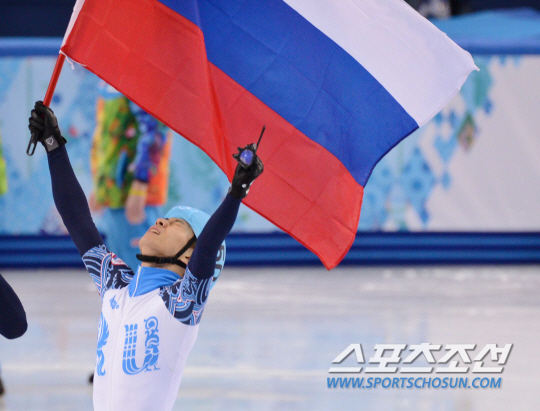 15일 오후(한국시간) 2014 소치 동계올림픽 아이스버그 스케이팅 팰리스에서 남자 쇼트트랙 1000m 결승전이 열렸다. 금메달을 차지한 빅토르안(안현수)이 러시아 국기를 들고 환호하고 있다. 소치(러시아)= 김경민 기자 kyungmin@sportschosun.com / 2014.02.15.