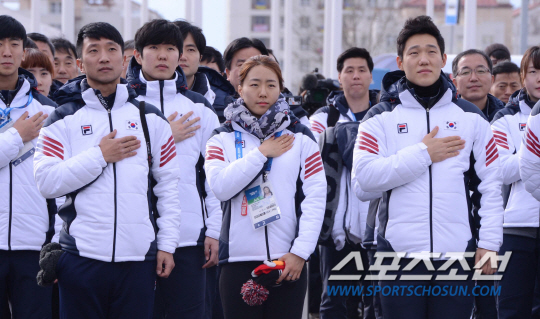 5일 오후(한국시간) 2014 소치 동계올림픽 선수촌 국기광장에서 대한민국 선수단의 공식 입촌식이 열렸다. 입촌식에서 이규혁(왼쪽부터), 이상화, 모태범이 국기에 대한 경례를 하고 있다. 소치(러시아)= 김경민 기kyungmin@sportschosun.com / 2014.02.05.