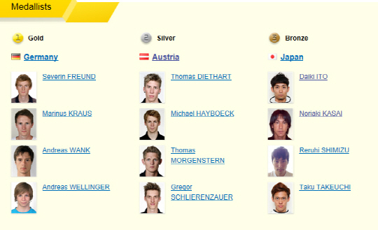 일본 스키점프 대표팀은 18일(한국시각) 러시아 소치 산악 클러스터의 루스키 고르키 점핑센터에서 열린 스키점프 남자 라지힐(K-125) 단체전에서 1024.9점을 얻으며 세계 3위에 올랐다. 금메달은 3연패에 도전하던 오스트리아(1038.4점)의 아성을 무너뜨린 독일(1041.1점)이 차지했다.