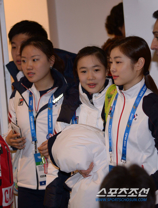 한국 피겨스케이팅 김연아(오른쪽부터), 김해진,박소연이 17일 러시아 소치 해안 클러스터 아이스버그 스케이팅 팰리스 경기장에서 열린 피겨스케이팅 쇼트프로그램 조추첨 행사장에 들어서고 있다. 소치(러시아)= 사진공동취재단 / 2014.02.17.