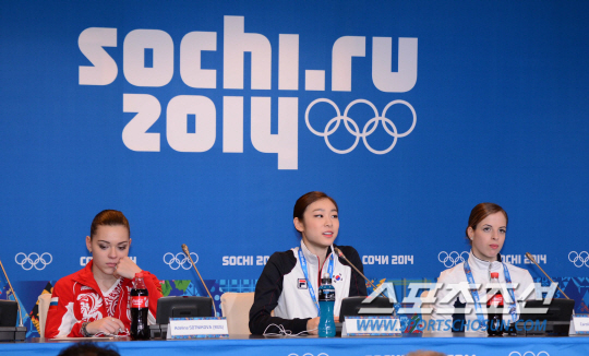 20일 오전(한국시간) 2014 소치 동계올림픽 아이스버그 스케이팅 팰리스에서 여자 피겨 쇼트프로그램 열렸다. 74.92로 쇼트프로그램 1위를 차지한 김연아가 2위를 차지한 러시아 아델리나 소트니코바(왼쪽), 3위를 차지한 이탈리아 카롤리나 코스트너와 기자회견을 하고 있다. 소치(러시아)= 김경민 기자 kyungmin@sportschosun.com