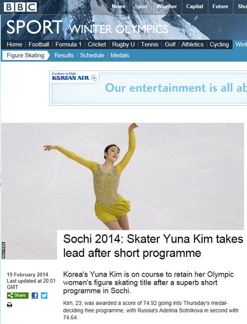 영국 방송 BBC는 "김연아가 올림픽 2연패를 향해 순항했다. 최고의 연기를 펼쳤다"고 전했고, 미국의 NBC는 "올림픽 챔피언 김연아가 여자 쇼트 프로그램에서 1위를 차지했다"며 김연아 경기 소식을 비중 있게 다뤘다.