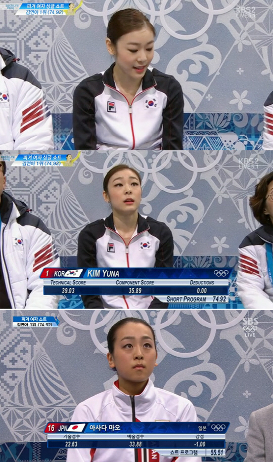 키스앤크라이존에서 점수를 확인한 김연아는 "아...진짜 짜다"고 자신도 모르게 탄식이 담긴 혼잣말을 해 경기를 지켜본 팬들의 아쉬움을 자아냈다. 하지만 이내 고개를 끄덕이며 수긍하는 모습으로 '피겨 퀸'다운 성숙한 모습을 보였다.