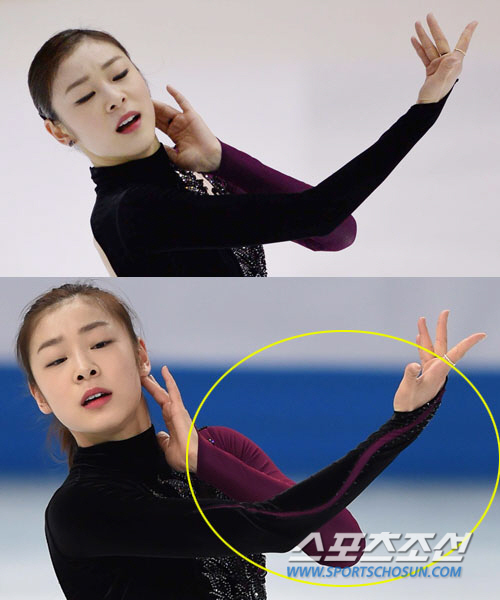또 오른팔 부분에 보라색 물결 모양의 새로운 포인트도 시선을 잡는다. 심판들에게 선명한 스핀 모습을 위해 왼쪽 팔 부분을 올 블랙에서 보라색으로 한차례 변화를 줬던 김연아는 오른 팔 부분도 살짝 보라색 포인트를 줌으로써 디자인적인 조화를 가미했다.