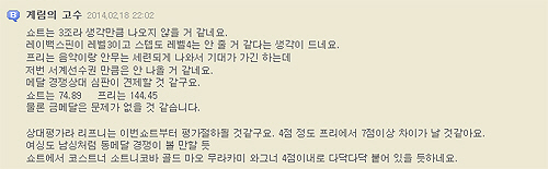 그중 '계림의 고수'라는 닉네임을 사용하는 한 네티즌이 남긴 댓글이 눈길을 끌고 있다. 이 네티즌은 김연아의 쇼트 프로그램 점수를 74.89점으로 예측했다.