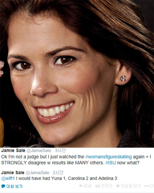 제이미 살레는 21일(한국시간) 자신의 트위터에 "난 심판은 아니지만 여자 피겨 싱글 경기를 다시 봤다"며 "난 이 결과를 '결단코' 받아들일 수 없다. 많은 다른 사람들처럼"이라고 분통을 드러냈다.
