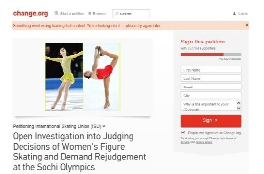 세계적인 인권 회복 청원 사이트인 '체인지'(change.org)에서 소치동계올림픽 여자 피겨스케이팅 경기결과에 항의하는 네티즌 청원 운동을 시작했다. 가산점 등 판정 논란 속에 러시아 신예 소트니코바에 이어 은메달을 따낸 김연아에게 금메달을 되찾아주기 위한 서명운동이다. 해당 경기 심판진에 대한 조사와 재심을 요구하고 나섰다. (https://www.change.org/en-CA/petitions/international-skating-union-isu-open-investigation-into-judging-decisions-of-women-s-figure-skating-and-demand-rejudgement-at-the-sochi-olympics)