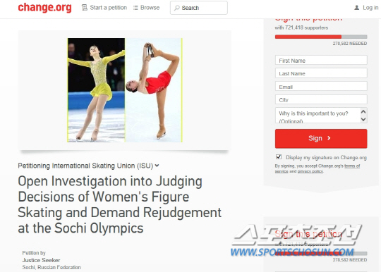 김연아가 21일 소치동계올림픽 여자프리스케이팅에서 완벽한 클린 연기에도 불구하고 프리스케이팅에서 144.29점을 기록, 총점 219.11점으로 은메달에 그친 것에 대한 의혹과 불만이 폭발했다. 세계적인 인권 회복 청원 사이트인 '체인지'(change.org)에서 소치동계올림픽 여자 피겨스케이팅 경기결과에 항의하는 네티즌 청원 운동을 시작했다. 가산점 등 판정 논란 속에 러시아 신예 소트니코바에 이어 은메달을 따낸 김연아에게 금메달을 되찾아주기 위한 서명운동이다. 해당 경기 심판진에 대한 조사와 재심을 요구하고 나섰다. (https://www.change.org/en-CA/petitions/international-skating-union-isu-open-investigation-into-judging-decisions-of-women-s-figure-skating-and-demand-rejudgement-at-the-sochi-olympics)