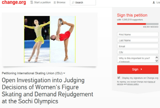 21일 세계적인 인권 회복 청원 사이트인 체인지닷오알지(Change.org)에는 "소치 동계 올림픽 여자 피겨스케이팅 심판 판정에 대한 조사와 재심사를 촉구한다"라는 제목으로 인터넷 서명 운동이 진행되고 있다.