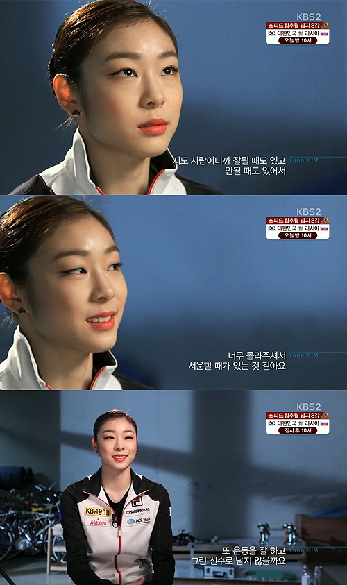 이날 김연아는 "훈련 과정은 못 보시고 항상 잘하는 모습만 보여드리다 보니까 (잘한다고) 그렇게 생각하시는 것 같은데 저도 사람이니까 잘 될 때도 있고 안 될 때도 있다"라고 솔직하게 말했다.