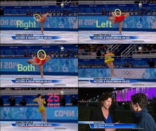 이어 김연아의 점프 장면과 비교 분석했다. ABC는 김연아가 경기직전 준비시간에 긴장한 모습이 역력했지만, 경기에서 보여준 점프는 완벽했다고 칭찬했다. 어깨와 허리 방향이 완벽하게 일치하는 데다 점프 비거리가 25피트(7m 62cm)에 완벽한 착지까지 보여줬다고 분석했다.