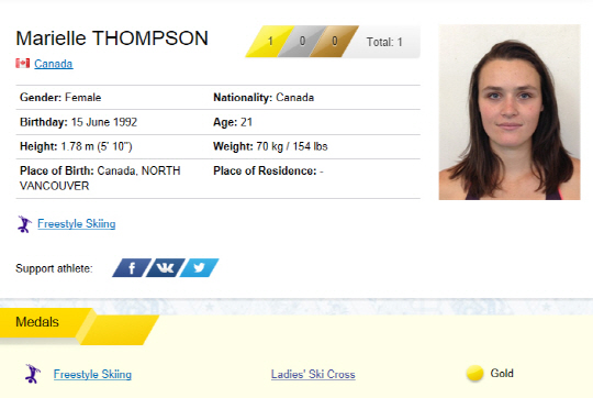 캐나다가 2014년 소치동계올림픽 프리스타일 스키에서 금메달을 추가했다. 캐나다의 매리엘 톰슨은 21일(한국시각) 로사 쿠토르 익스트림파크에서 열린 경기에서 팀 동료인 켈시 세르와를 제치고 정상에 올랐다. 스웨덴의 안나 홀름룬드가 동메달을 차지했다. 프리스타일 스키 크로스 경기는 4~5명이 한 조로 장애물들이 있는 코스를 점프와 질주로 통과하는 경기다.