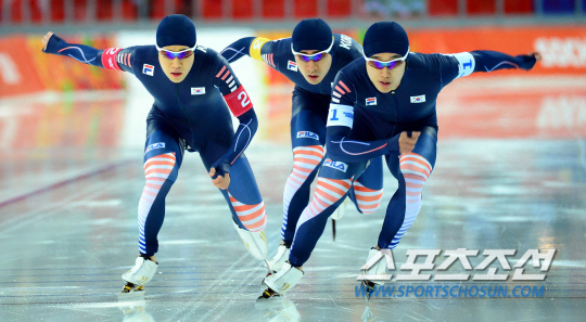 이승훈(가운데)과 주형준, 김철민, 남자 스피드 스케이팅 대표팀 선수들이 21일 소치 해안 클러스터의 아들레르 아레나에서 열린 남자 팀추월 경기에서 질주하고 있다. 소치(러시아)= 김경민 기자 kyungmin@sportschosun.com