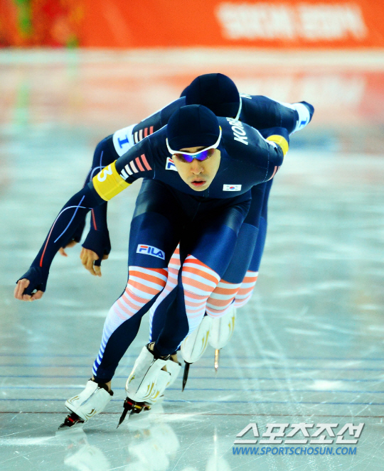 이승훈 등 스피드 스케이팅 대표팀 선수들이 21일 소치 해안 클러스터의 아들레르 아레나에서 열린 남자 팀추월 경기에서 질주하고 있다. 소치(러시아)= 김경민 기자 kyungmin@sportschosun.com / 2014.02.21.