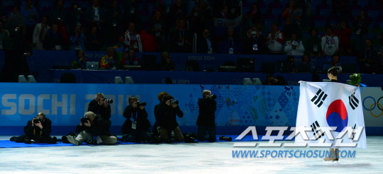 피겨 스케이팅 대표팀의 김연아가 20일(현지 시간) 오전 소치 해안클러스터의 아이스버그 스케이팅 팰리스에서 여자 싱글 프리 경기를 마친 후 석연찮은 판정으로 은메달에 그쳤다. 경기 직후 이어진 플라워 세리모니에서 취재진의 촬영 요청에 응하고 있다. 소치(러시아)= 김경민 기자 kyungmin@sportschosun.com / 2014.02.21.